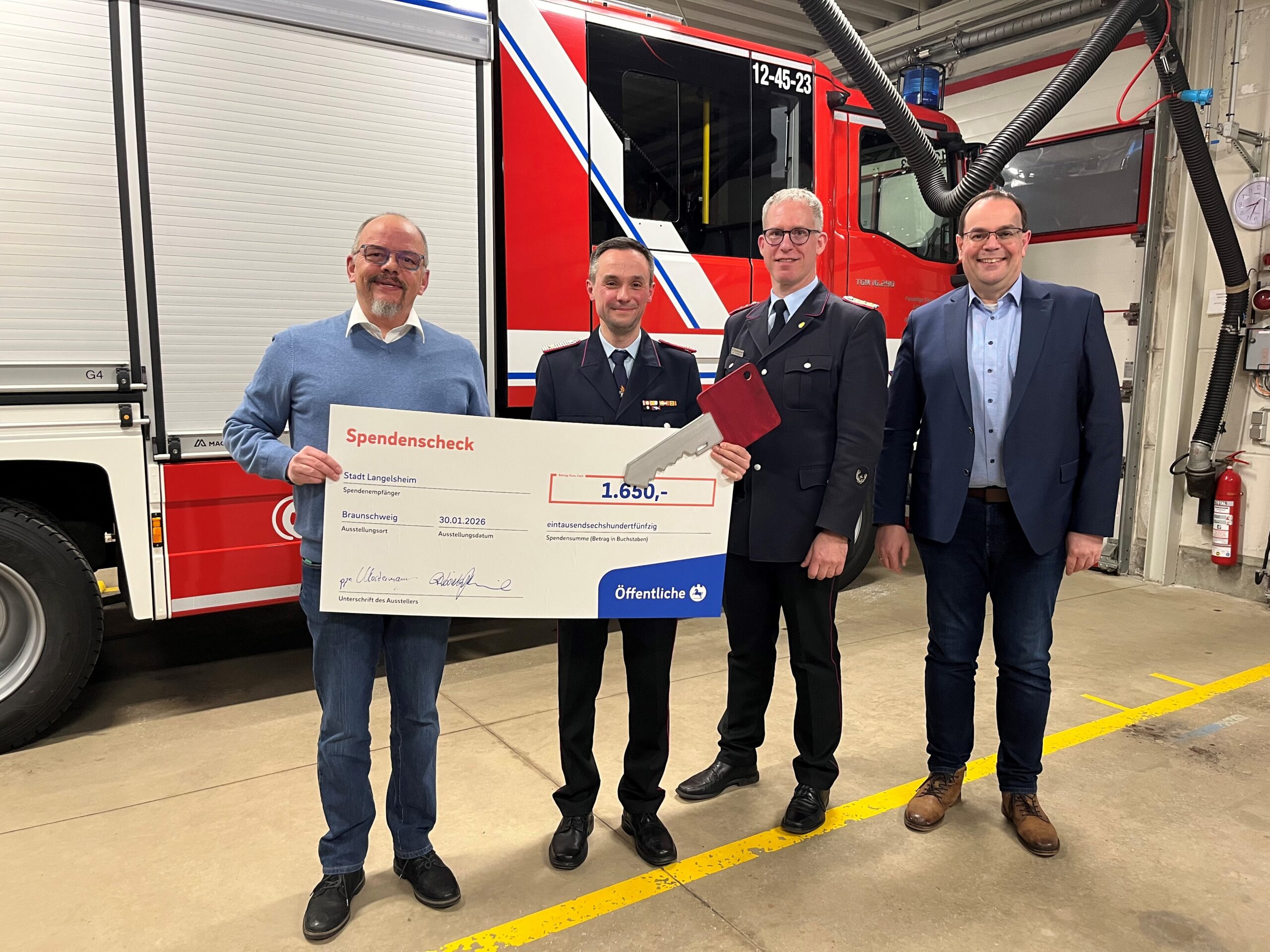 Bürgermeister Ingo Henze übergab Ende Januar den symbolischen Schlüssel an den Ortsbrandmeister der Ortsfeuerwehr Bergstadt Lautenthal Philip Glomba und Stadtbrandmeister Matthias Brunke. Das Löschgruppenfahrzeug (LF) 10 hat rund 390.000 Euro gekostet.