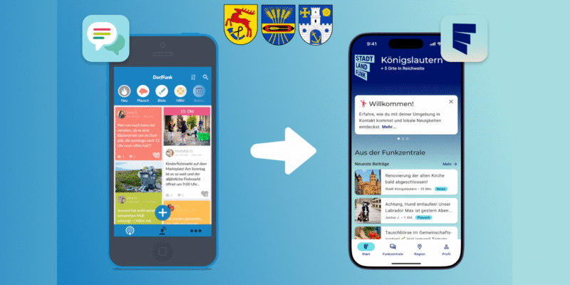 Der DorfFunk ist 2018 im Rahmen des Forschungsprojekts „Digitale Dörfer“ beim Fraunhofer IESE entstanden. Als Forschungsinstitut kann Fraunhofer Apps nicht dauerhaft selbst betreiben. Darum wurde gemeinsam mit der ÖRAG Rechtsschutzversicherung AG (Teil der Sparkassen- und Genossenschafts-Finanzgruppe) und unserem langjährigen Partner, der Versicherungskammer Bayern (Betreiber des BayernFunks), die Smartes Land GmbH gegründet. Ihr Ziel: die Digitalisierung im kommunalen Bereich dauerhaft voranzutreiben.
