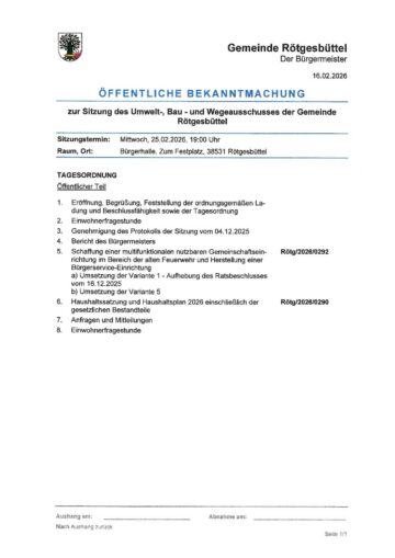Bekanntmachung Sitzung Umwelt-, Bau- und Wegeausschuss am 25.02.2026 Gemeinde Rötgesbüttel Posted on 16. Feb 2026