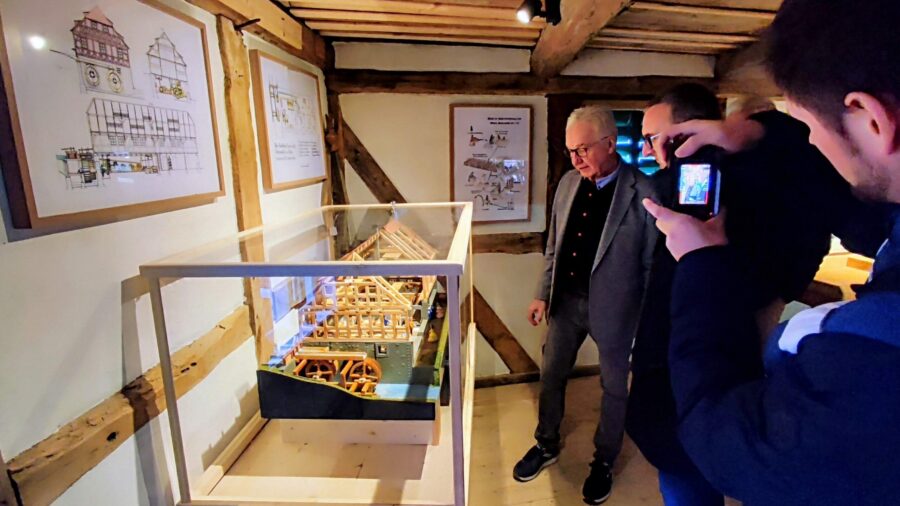 Den Rundgang durch die Mühle leitete Diemar Hoffmann. Gezeigt wurden die restaurierte Mahltechnik, der Papierherstellungsprozess anhand von Modellen und Originalexponaten, der neu gestaltete Raum mit Holz- und Lehmsteinarchitektur sowie die Galerie. Der Eindruck: ein historischer Ort mit aktueller Nutzung, getragen von ehrenamtlichem Engagement.