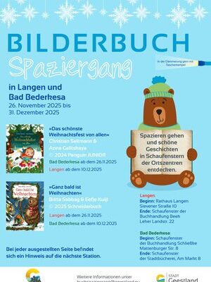 Die Aktion wird von der Stadtbücherei und der Wirtschaftsförderung organisiert und findet vom 26. November bis 31. Dezember 2025 in den Ortsmitten von Langen und Bad Bederkesa statt. Der Spaziergang soll für Unterhaltung in der Vorweihnachtszeit sorgen, zum Entdecken des eigenen Wohnorts einladen, aber auch dazu animieren, die Geschäfte vor Ort zu unterstützen.