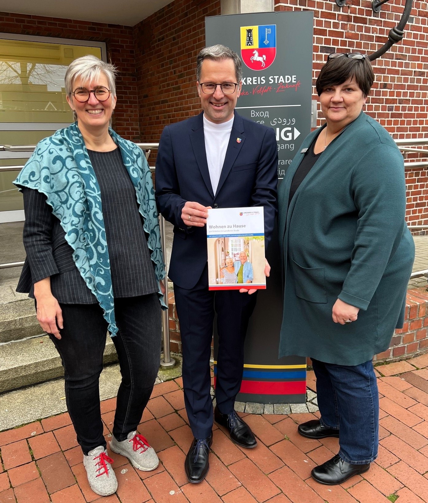 Sylvia Pankop vom Senioren- und Pflegestützpunkt des Landkreises Stade, Landrat Kai Seefried und Susanne Brahmst, Dezernentin für Soziales, Gesundheit, Jugend und Familie, freuen sich über die neue kostenlose Broschüre „Wohnen zu Hause“, die wichtige Informationen und nützliche Tipps zur Wohnraumanpassung bietet.