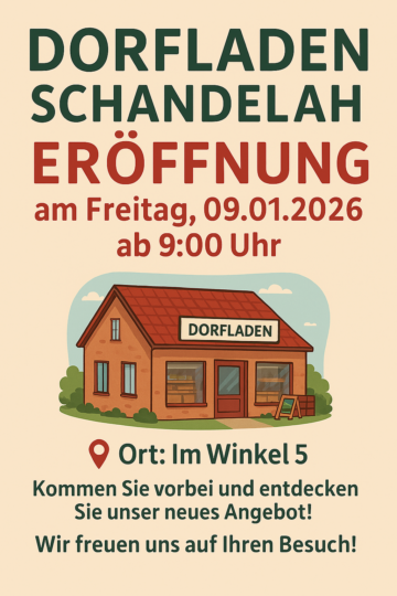 Allgemeines Dorfladen Schandelah eröffnet am Freitag den 09.01.2026 ab 9 Uhr Newsticker Posted on 07. Jan 2026