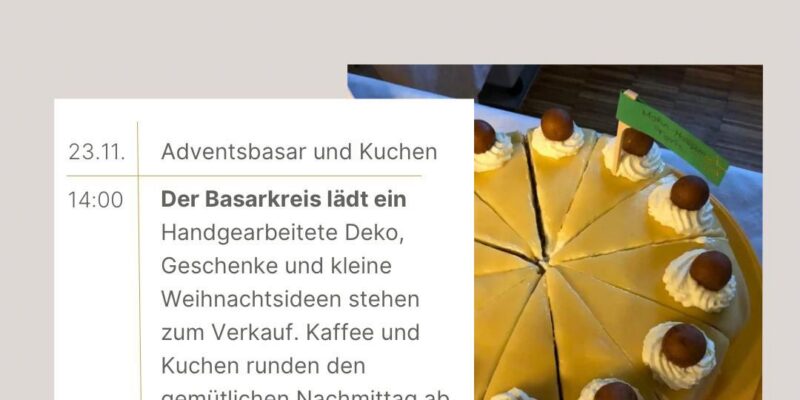 Handgearbeitete Deko, Geschenke und kleine Weihnachtsideen stehen zum Verkauf. Kaffee und Kuchen runden den gemütlichen Nachmittag ab. Die Erlöse kommen dem Haus der Kirche zugute.
