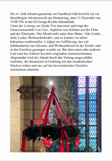11. Dez Veranstaltung Schandelah Adventssingen in der St.Georg Kirche Schandelah mit dem Gitarren-Ensemble Con.Tact Kulturverein und Johannisgemeinde am Sandbach Posted on 17. Nov 2025 Add to calendar zu Google Kalender hinzufügen iCalendar Outlook 365 Outlook Live Details Datum: 11. Dezember Zeit: 19:00 - 21:00 Veranstaltungsort Kirche Schandelah Veranstalter Kulturverein und Johannisgemeinde am Sandbach