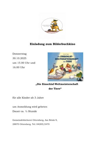 30. Okt Veranstaltung Ottersberg Bilderbuchkino Gemeindebücherei Ottersberg Posted on 27. Okt 2025 Add to calendar zu Google Kalender hinzufügen iCalendar Outlook 365 Outlook Live Details Datum: 30. Oktober Zeit: 15:00 - 16:30 Veranstaltungsort Gemeindebücherei Ottersberg Am Brink 9 Ottersberg, 28870 + Google Karte Phone 04205/2470 Veranstalter Gemeindebücherei Ottersberg Phone 04205/ 2470