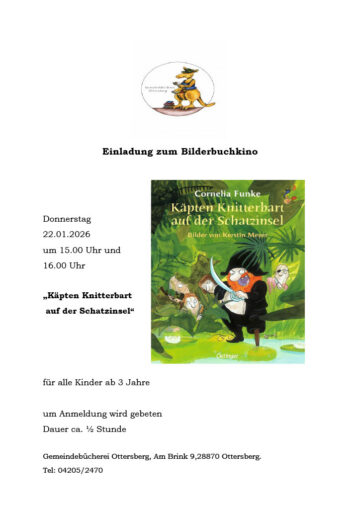 22. Jan Veranstaltung Bilderbuchkino Gemeindebücherei Ottersberg Posted on 05. Jan 202605. Jan 2026 Add to calendar zu Google Kalender hinzufügen iCalendar Outlook 365 Outlook Live Details Datum: 22. Januar Zeit: 15:00 - 16:00 Veranstaltungskategorie: Kinder & Jugend Veranstaltungsort Gemeindebücherei Ottersberg Am Brink 9 Ottersberg, 28870 + Google Karte Phone 04205/2470 Veranstalter Gemeindebücherei Ottersberg Phone 04205/ 2470