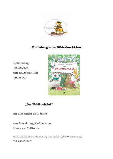 19. Feb Veranstaltung Bilderbuchkino Gemeindebücherei Ottersberg Posted on 22. Jan 2026 Add to calendar zu Google Kalender hinzufügen iCalendar Outlook 365 Outlook Live Details Datum: 19. Februar Zeit: 15:00 - 16:30 Veranstaltungskategorie: Kinder & Jugend Veranstaltungsort Gemeindebücherei Ottersberg Am Brink 9 Ottersberg, 28870 + Google Karte Phone 04205/2470 Veranstalter Gemeindebücherei Ottersberg Phone 04205/ 2470