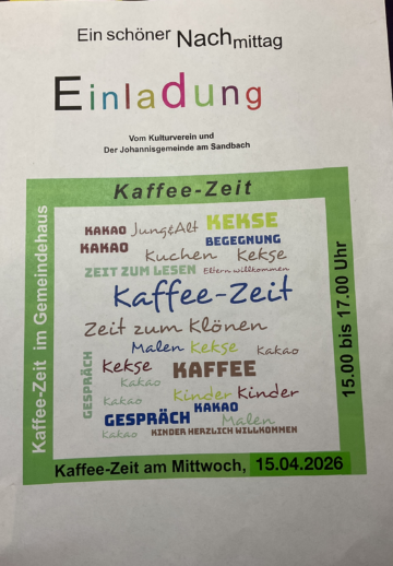 15. Apr Veranstaltung Kaffee-Zeit am 15. April in Schandelah Kulturverein und Johannisgemeinde am Sandbach Posted on 10. Apr 2026 Add to calendar zu Google Kalender hinzufügen iCalendar Outlook 365 Outlook Live Details Datum: 15. April Zeit: 15:00 - 17:00 Veranstaltungskategorie: Veranstaltungen Veranstaltungsort Gemeindehaus an der Kirche Hordorfer Str. 8 Schandelah, 38162 + Google Karte Veranstalter Kulturverein und Johannisgemeinde am Sandbach