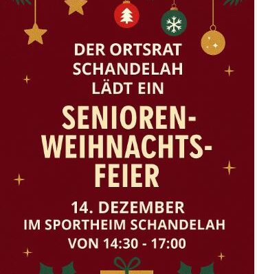 14. Dez Veranstaltung Schandelah Senioren Weihnachtsfeier 14. Dezember, 14:30 im Sportheim Posted on 02. Nov 202502. Nov 2025 Add to calendar zu Google Kalender hinzufügen iCalendar Outlook 365 Outlook Live Details Datum: 14. Dezember Zeit: 14:30 - 17:00 Veranstaltungsort Sportheim Schandelah im Anbau Schandelah, 38162 Deutschland + Google Karte View Veranstaltungsort Website