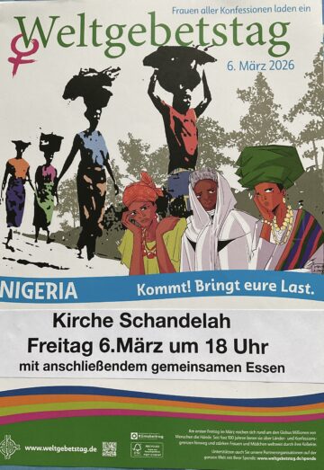 06. Mrz Veranstaltung Weltgebetstag am 6.März in der Schandelaher Kirche Johannisgemeinde am Sandbach Posted on 21. Feb 2026 Add to calendar zu Google Kalender hinzufügen iCalendar Outlook 365 Outlook Live Details Datum: 6. März Zeit: 18:00 - 20:00 Veranstaltungskategorie: Allgemeines Veranstaltungsort Kirche Schandelah Veranstalter Johannisgemeinde am Sandbach