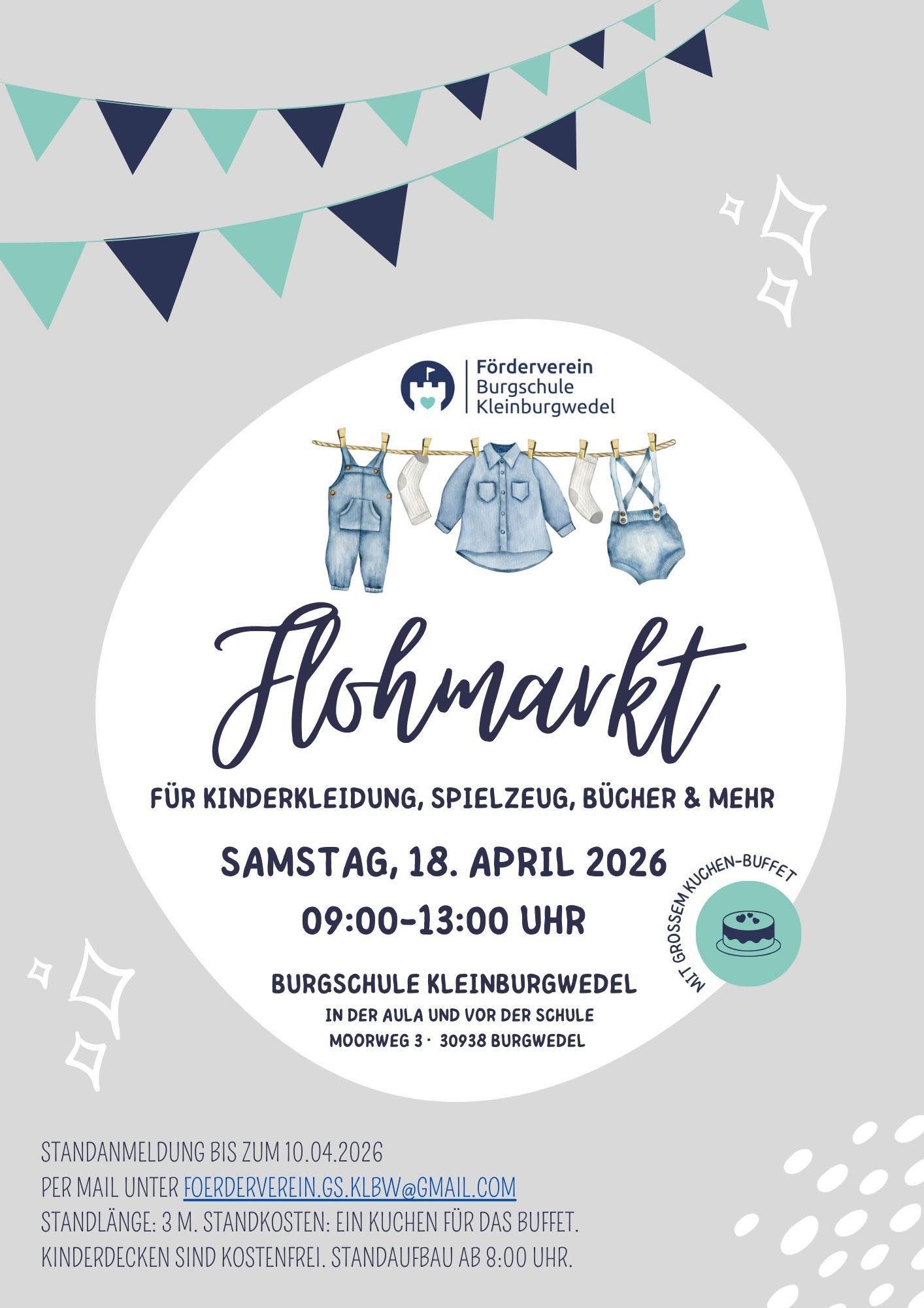 Flohmarkt Burgschule Kleinburgwedel 18.04.2026 | 09–13 Uhr Kinderkleidung, Spielzeug, Bücher & mehr Du willst verkaufen? Standanmeldung bis 17.04.2026 foerderverein.gs.klbw@gmail.com 3 m Standfläche – 1 Kuchen fürs Buffet Kinderdecken kostenfrei Wir… |