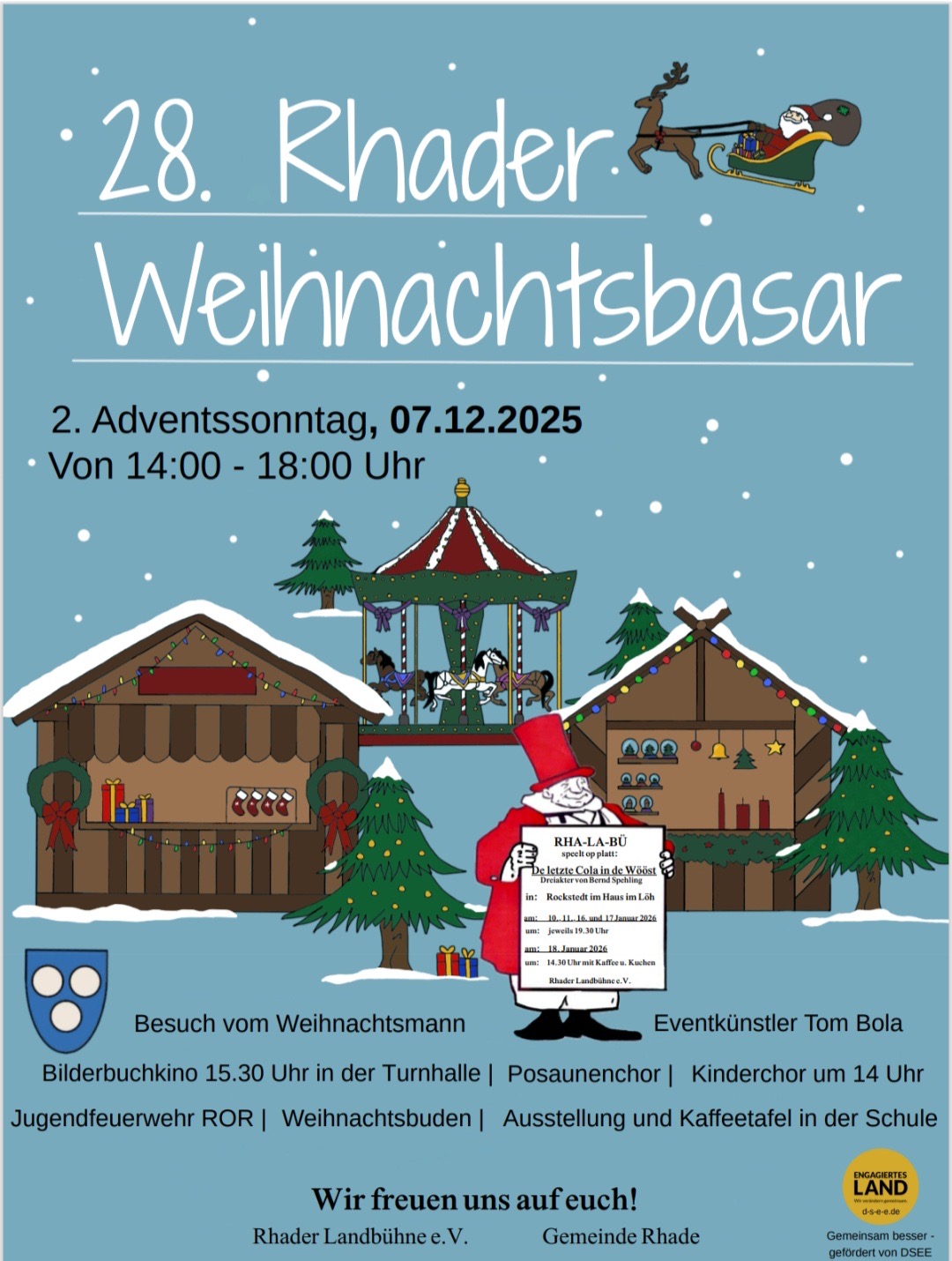 Grundschule Rhade Am Sportplatz 2,Rhade,Niedersachsen,DeutschlandBesuch vom Weihnachtsmann Eventkünstler Tom Bola Bilderbuchkino 15.30 Uhr in der Turnhalle Posaunenchor Kinderchor um 14 Uhr Jugendfeuerwehr ROR Weihnachtsbuden Ausstellung und Kaffeetafel in der Schule Wir freuen uns auf…