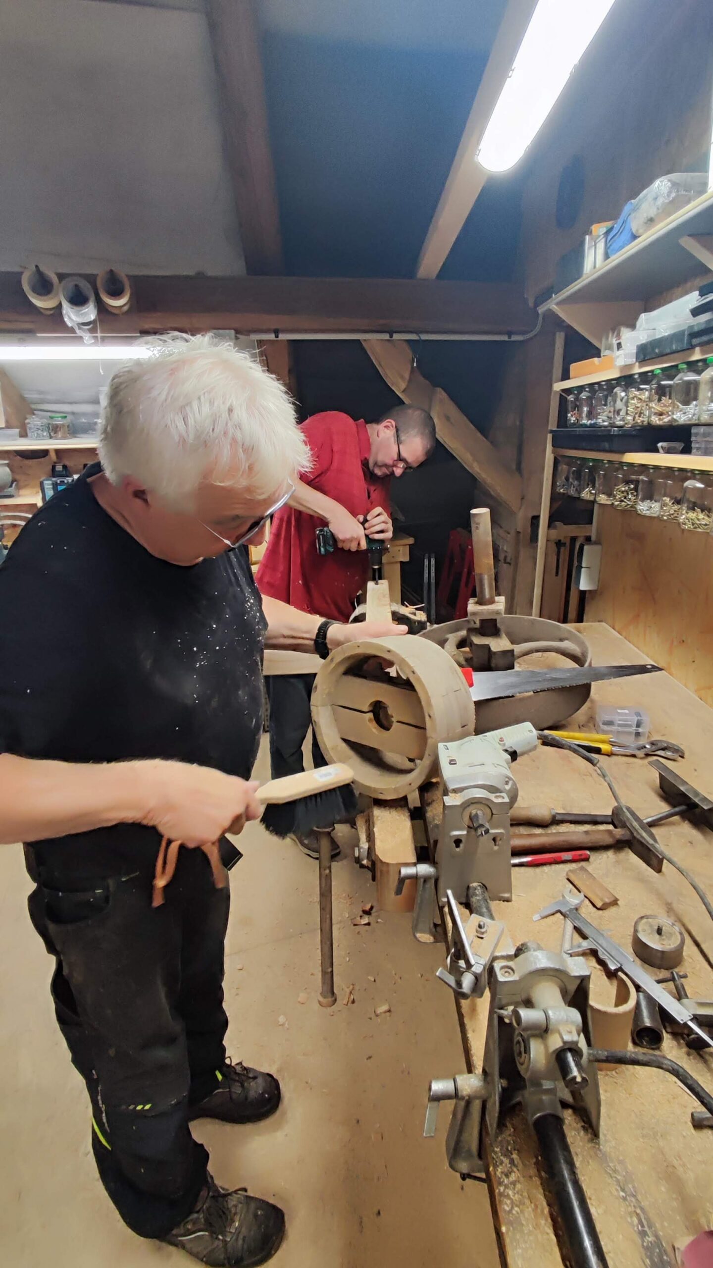Holzarbeiten für die Mehlmischanlage. Rüdiger Hagen (r.) und Dietmar Hoffmann ergänzen sich.