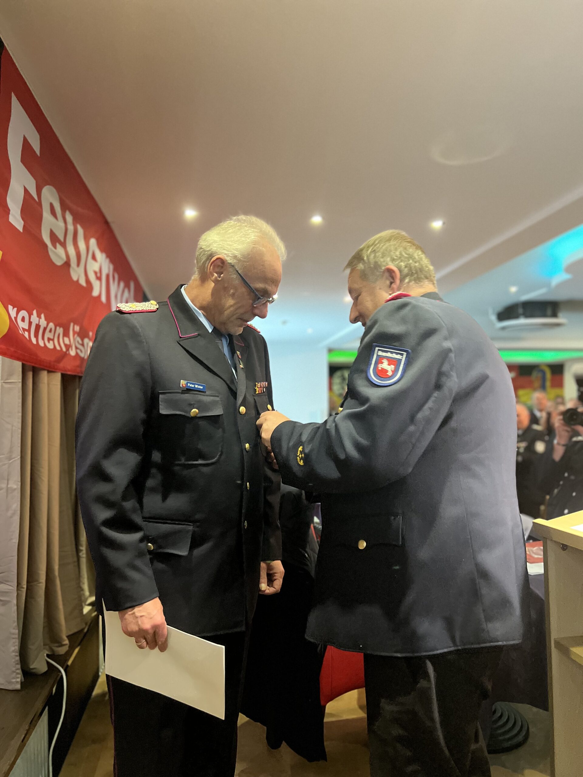 Von Regierungsbrandmeister Uwe Quante erhält Kreisbrandmeister Peter Winter die Ehrenmedaille des Landesfeuerwehrverbandes in Gold.