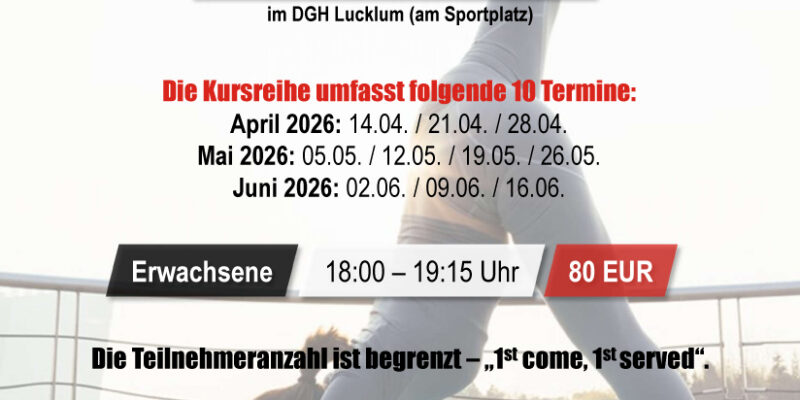 Der Kurs wird unter Anleitung einer ausgebildeten Trainerin für „Hatha Yoga“ durchgeführt. Er findet immer Dienstags von 18:00-19:15 Uhr an folgenden, zehn fest vereinbarten Terminen im Dorfgemeinschaftshaus (DGH) Lucklum am Sportplatz statt: