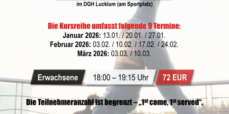 Der Kurs findet immer Dienstags von 18:00-19:15 Uhr an folgenden, neun fest vereinbarten Terminen im Dorfgemeinschaftshaus (DGH) Lucklum am Sportplatz statt: