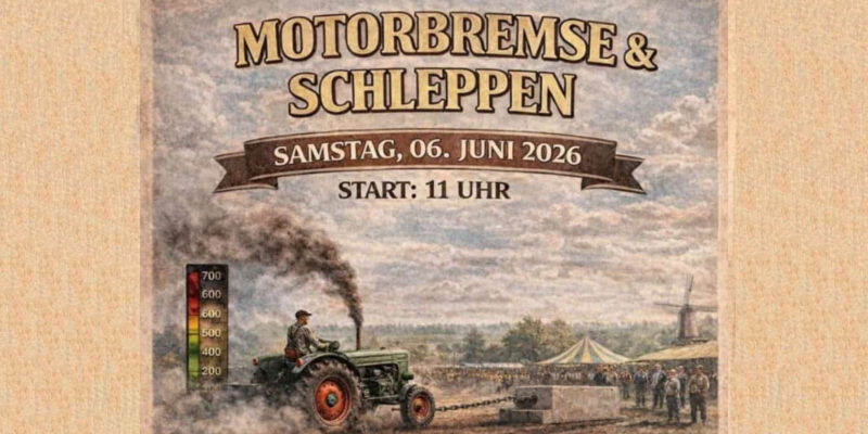 Samstag, 06. Juni 2026 Start: 11 Uhr Ziehen einer Metallplatte mit Gewicht Motorbremse für Schlepper bis 100 PS Kinder-Tretttrecker-Parcours Für Speis und Trank ist gesorgt Erst wird gezogen,dann wird geschnackt…