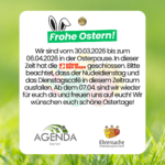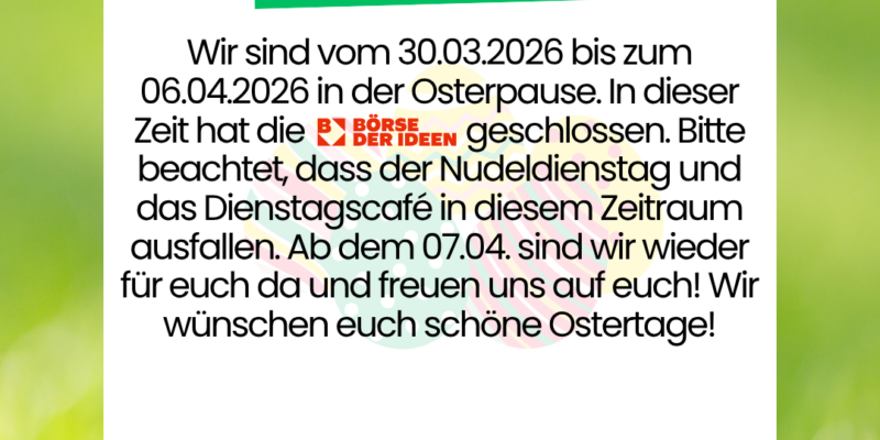 Wir sind vom 30.03.2026 bis zum 06.04.2026 in der Osterpause. In dieser Zeit hat die Börse geschlossen. Bitte beachtet, dass der Nudeldienstag und das Dienstagscafé in diesem Zeitraum ausfallen. Ab dem 07.04. sind wir wieder für euch da und freuen uns auf euch! Wir wünschen euch schöne Ostertage!