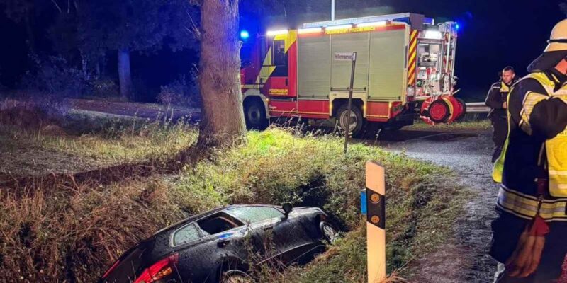 Ein PKW war von der Fahrbahn abgekommen und in einen Straßengraben geraten, der Fahrer des PKW wurde dadurch in seinem Fahrzeug eingeschlossen.