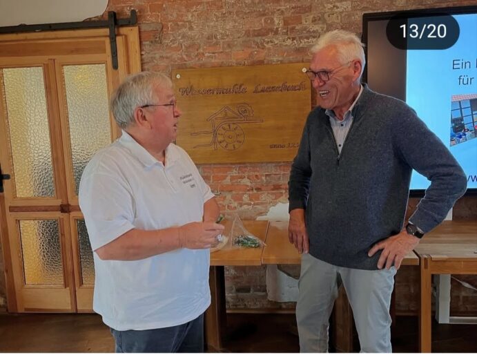 Zum Ende des Besuchs überreichte Werner Potratz im Namen der Wahrenholzer Mühlenfreunde eine Spende, eine Kiste Wein sowie Andenken zum 600-jährigen Jubiläum der Wassermühle Wahrenholz. Damit verbunden war die Einladung, den Austausch im kommenden Jahr in Wahrenholz fortzuführen.